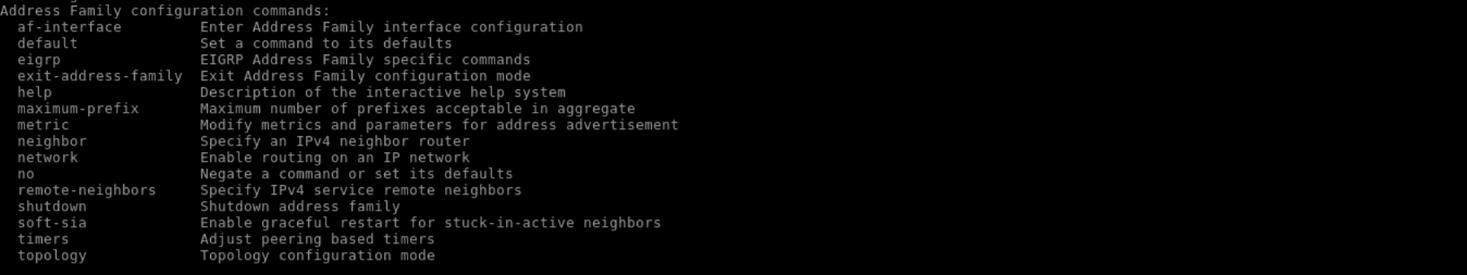 In EIGRP Named Mode, the name of the EIGRP process is any locally significant string. The address-family configuration specifies which particular AF EIGRP is configured in, such as IPv4, the sub-address-family identifier (SAFI), such as unicast, the routing table, such as global or VRF, and the autonomous system.